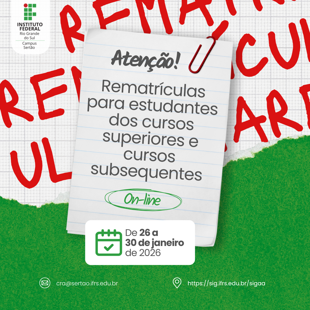 O período de rematrículas para estudantes dos cursos superiores e cursos subsequentes do Campus Sertão estará aberto de 26 a 30 de janeiro de 2026. Todo o procedimento deve ser realizado exclusivamente de forma on-line, por meio do Sistema Integrado de Gestão de Atividades Acadêmicas (SIGAA). Para isso, é indispensável que o estudante possua cadastro ativo no sistema. Aqueles que ainda não realizaram o cadastro, devem fazê-lo previamente para conseguir efetuar a rematrícula.