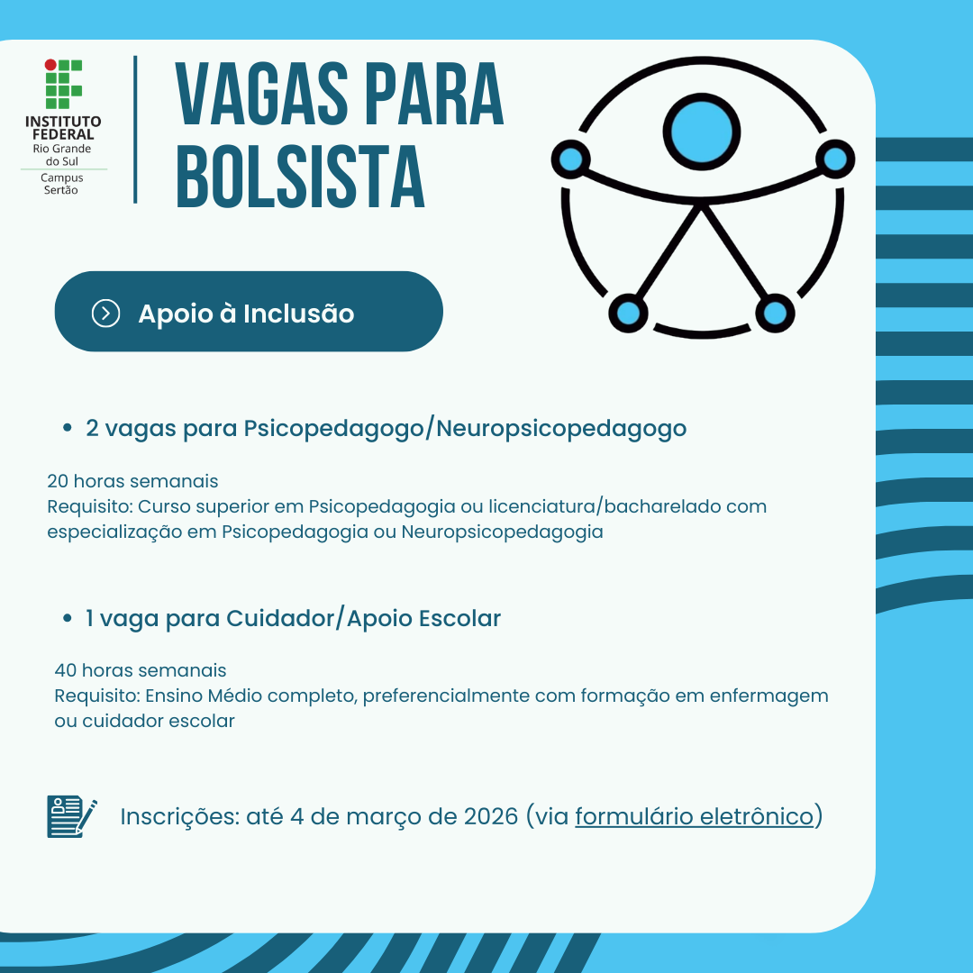 O Campus Sertão está com seleção aberta, até 4 de março, para contratação de Bolsistas de Apoio à Inclusão (Colaborador Externo), vinculados ao projeto de ensino Cuidar e Incluir: Ações Psicopedagógicas e de Apoio Escolar para a Permanência Estudantil no IFRS – Campus Sertão. O objetivo é selecionar profissionais para atuarem no acompanhamento pedagógico e no apoio educacional individualizado de estudantes com necessidades educacionais específicas (NEEs), promovendo inclusão, permanência e êxito escolar.