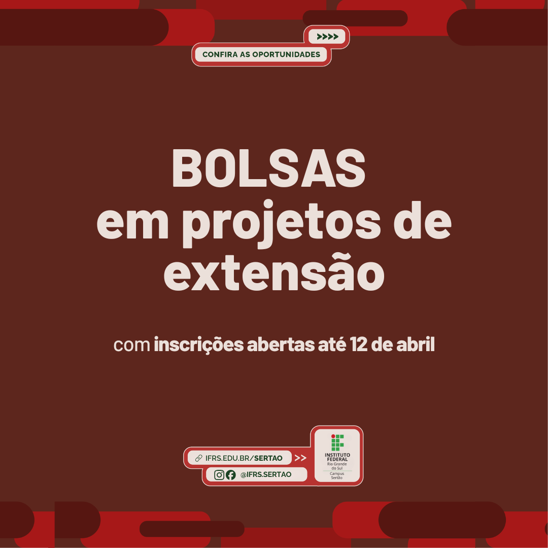 - O edital completo, com a descrição dos projetos, número de vagas e critérios de seleção, está disponível no link: https://ifrs.edu.br/sertao/editais/edital-dex-ifrs-campus-sertao-no-15-2026-selecao-de-bolsistas-de-extensao-2026/
