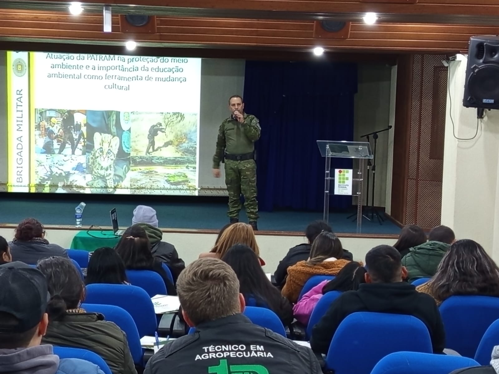 A palestra de abertura foi conduzida pelo Major Leandro da Cruz Góis, que apresentou o tema “Atuação da PATRAM na proteção do meio ambiente e a importância da educação ambiental como ferramenta de mudança cultural”. A fala destacou o papel da Patrulha Ambiental da Brigada Militar no combate a crimes ambientais e reforçou a importância da educação como agente transformador de condutas sociais em relação ao meio ambiente.