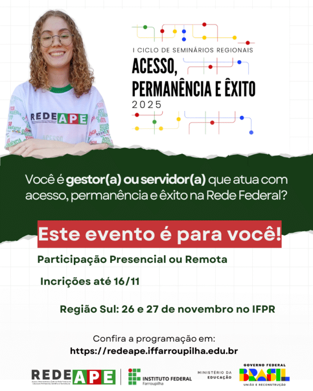 O  primeiro Ciclo de Seminários Regionais da Rede Acesso, Permanência e Êxito (APE), da  Região Sul, será realizado nos dias 26 e 27 de novembro de 2025, com transmissão ao vivo pelo canal da Web TV do Instituto Federal Farroupilha (IFFar). O evento é promovido pela Secretaria de Educação Profissional e Tecnológica do Ministério da Educação (Setec/MEC) e integra uma série de cinco encontros regionais que compõem o projeto nacional da Rede APE. Fazem parte da equipe da Rede APE a assistente social do Campus Sertão, Vanessa Neckel, e a estudante Gabriela Cristina Lins Superti do curso Licenciatura em Ciências Biológicas do Campus, representando não apenas o IFRS, mas os três institutos federais do Rio Grande Sul.