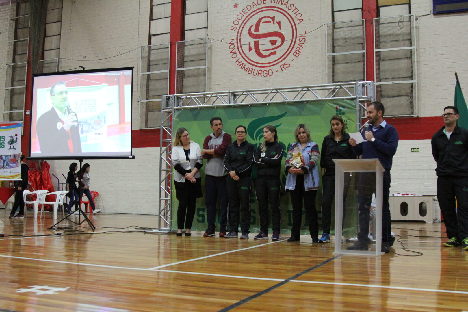 À noite, ocorreu a cerimônia de abertura oficial do 5º Jogos do IFRS. Em seu pronunciamento, Viviane Ramos, pró-reitora de Extensão do IFRS agradeceu e parabenizou a equipe de organização e lembrou: “este é o maior evento que envolve estudantes do IFRS. Defendam os jogos! Um projeto importante construído com tanto esforço e carinho”.