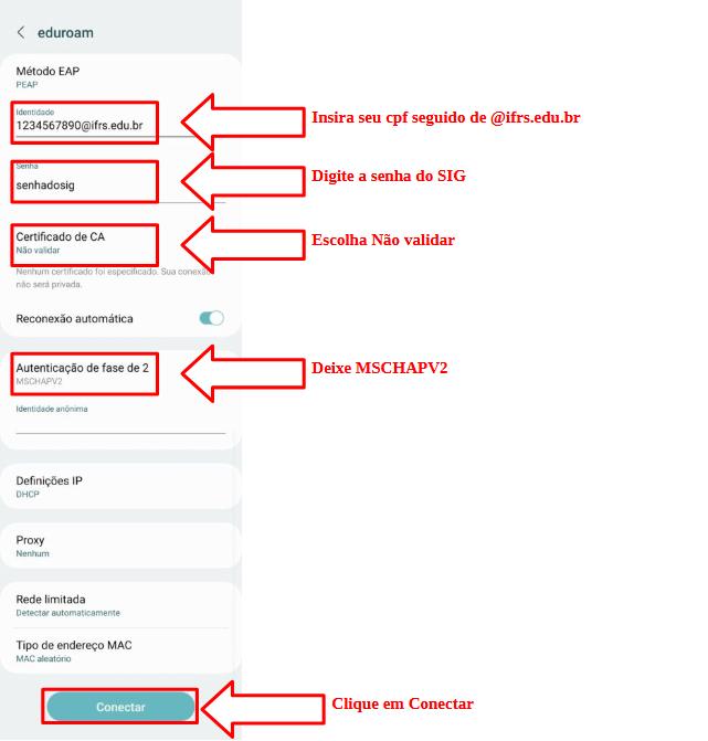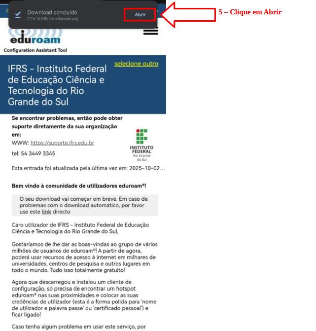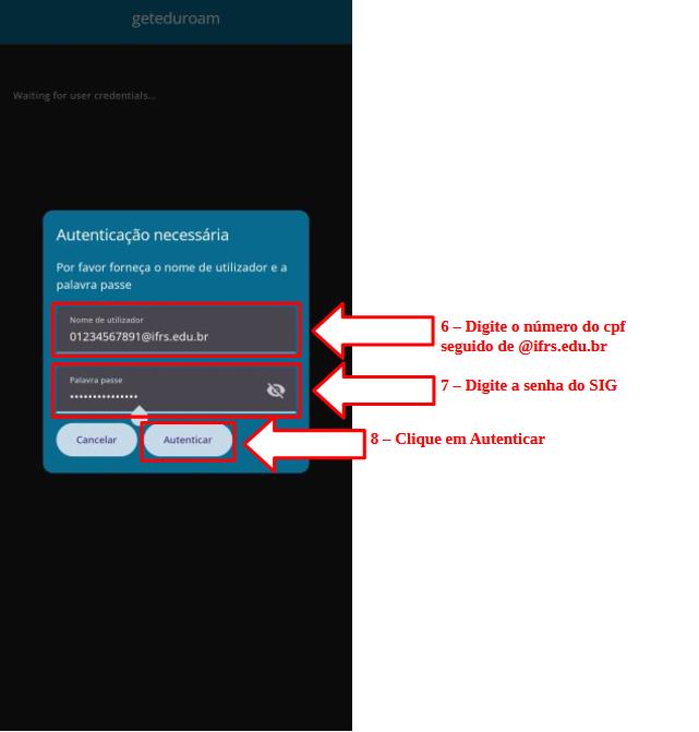 Certifique-se de que está usando o formato correto (ex: 01234567891@ifrs.edu.br) e que esteja usando o aplicativo geteduroam. Se o problema persistir, procure o suporte de TI do seu campus.