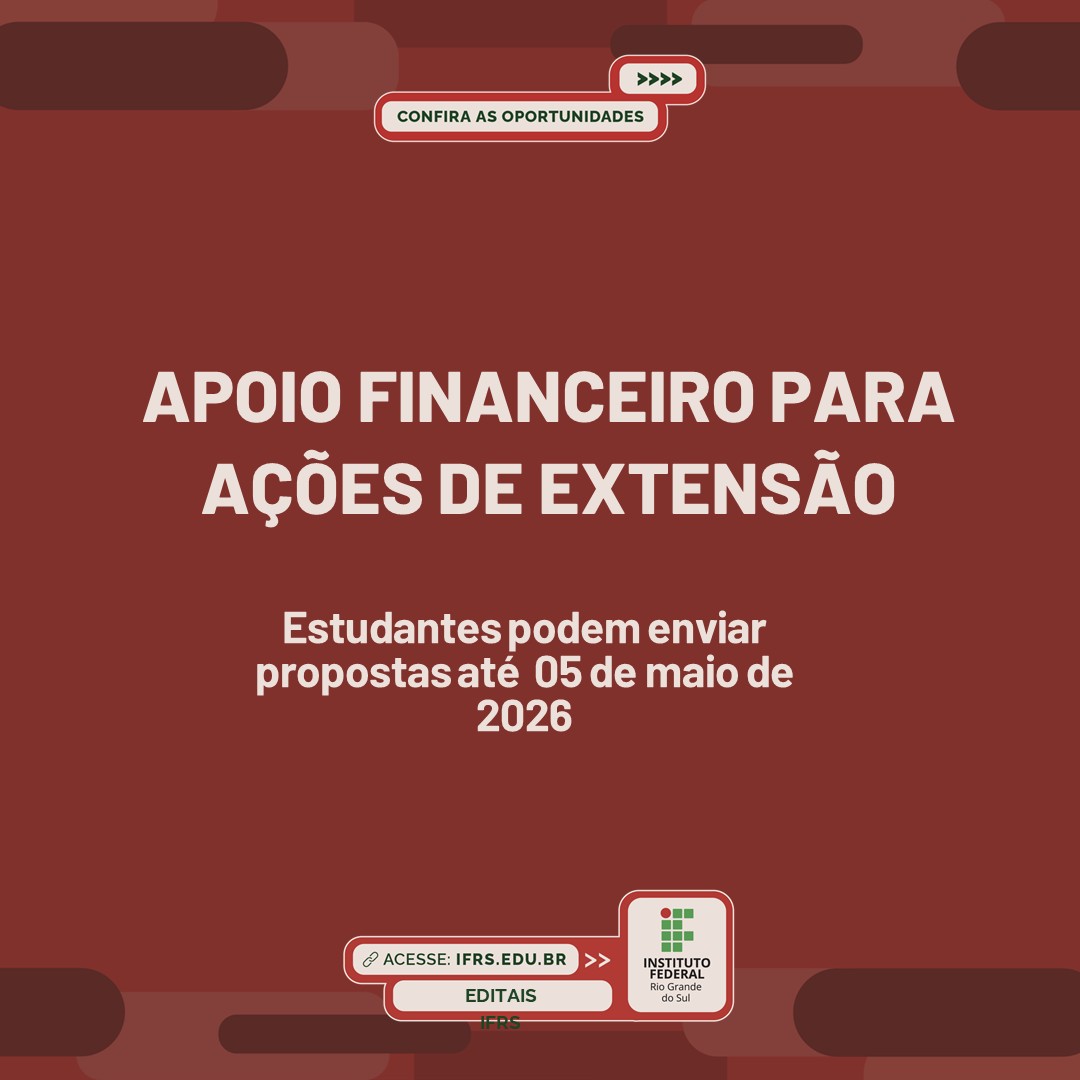 O Instituto Federal de Educação, Ciência e Tecnologia do Rio Grande do Sul (IFRS) publicou o Edital nº 14/2026, que trata da concessão de apoio financeiro para o desenvolvimento de ações de extensão propostas por estudantes da instituição. A iniciativa busca incentivar o protagonismo estudantil e fortalecer a integração entre o IFRS e a comunidade.