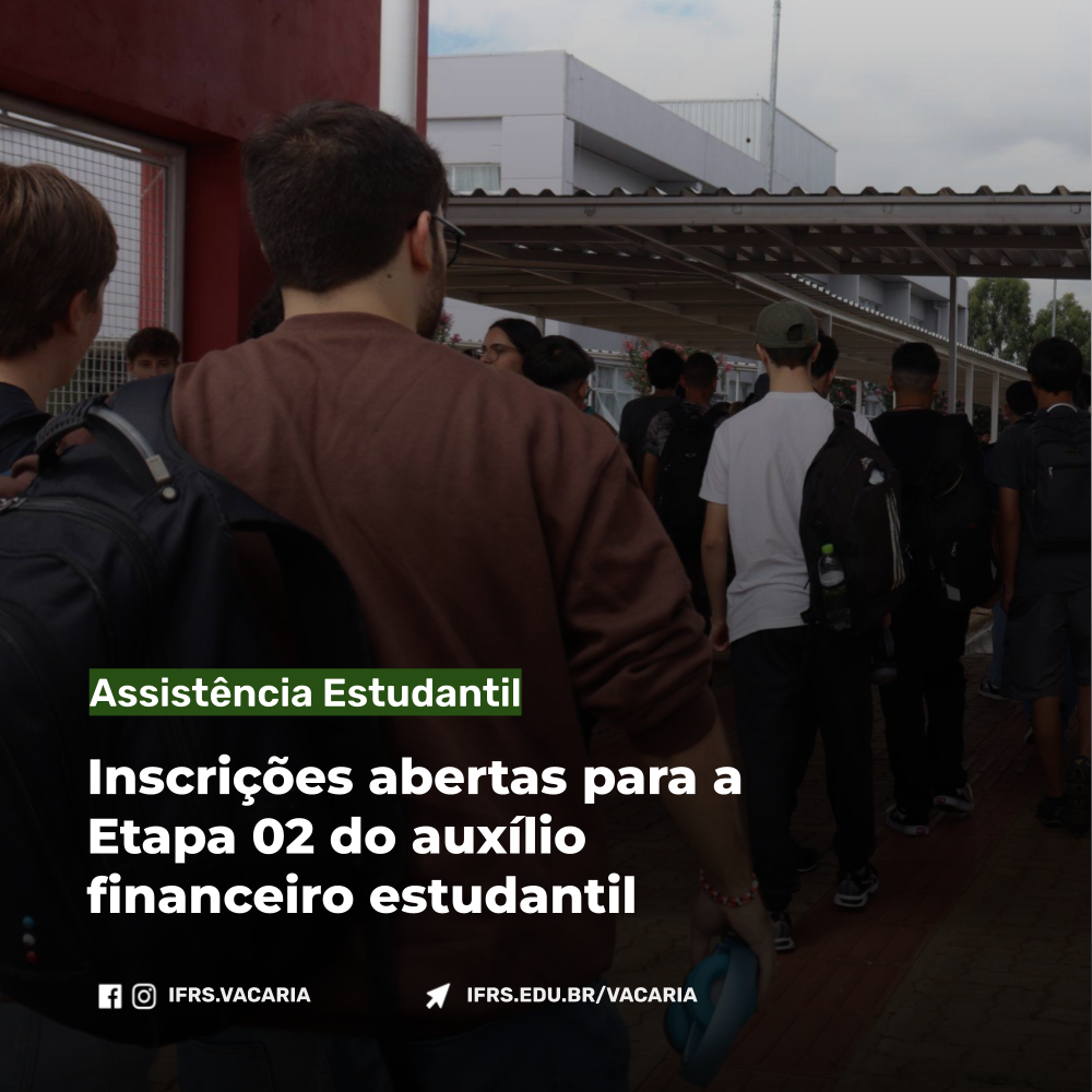 Estão abertas as inscrições para a Etapa 02 do Edital nº 58/2025, que trata da concessão de auxílio financeiro estudantil no âmbito do IFRS – Campus Vacaria.