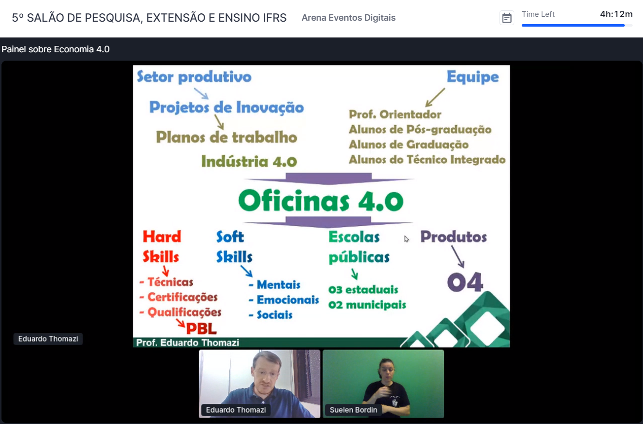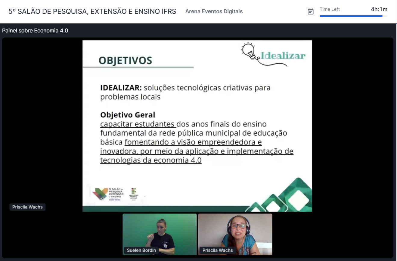 Em seguida, o assunto foi economia 4.0. Três projetos do IFRS selecionados em editais nacionais da área foram apresentados. Capacitação técnica e emocional de estudantes – do IFRS e de outras instituições -, aprendizagem baseada em projetos, indissociabilidade entre ensino, pesquisa e extensão são alguns pontos em comum entre as iniciativas. Cluster 4.0 – Fábrica de Aprendizagem, do Campus Caxias do Sul, teve a apresentação do professor Eduardo Thomazi. Para falar sobre o Projeto Idealizar, do Campus Canoas, participou a professora Priscila Wachs. Thiago Fonseca, técnico de Laboratório do Campus Rio Grande abordou o projeto “Automação, Conectividade e Tecnologia – Soluções inteligentes para a indústria 4.0”.