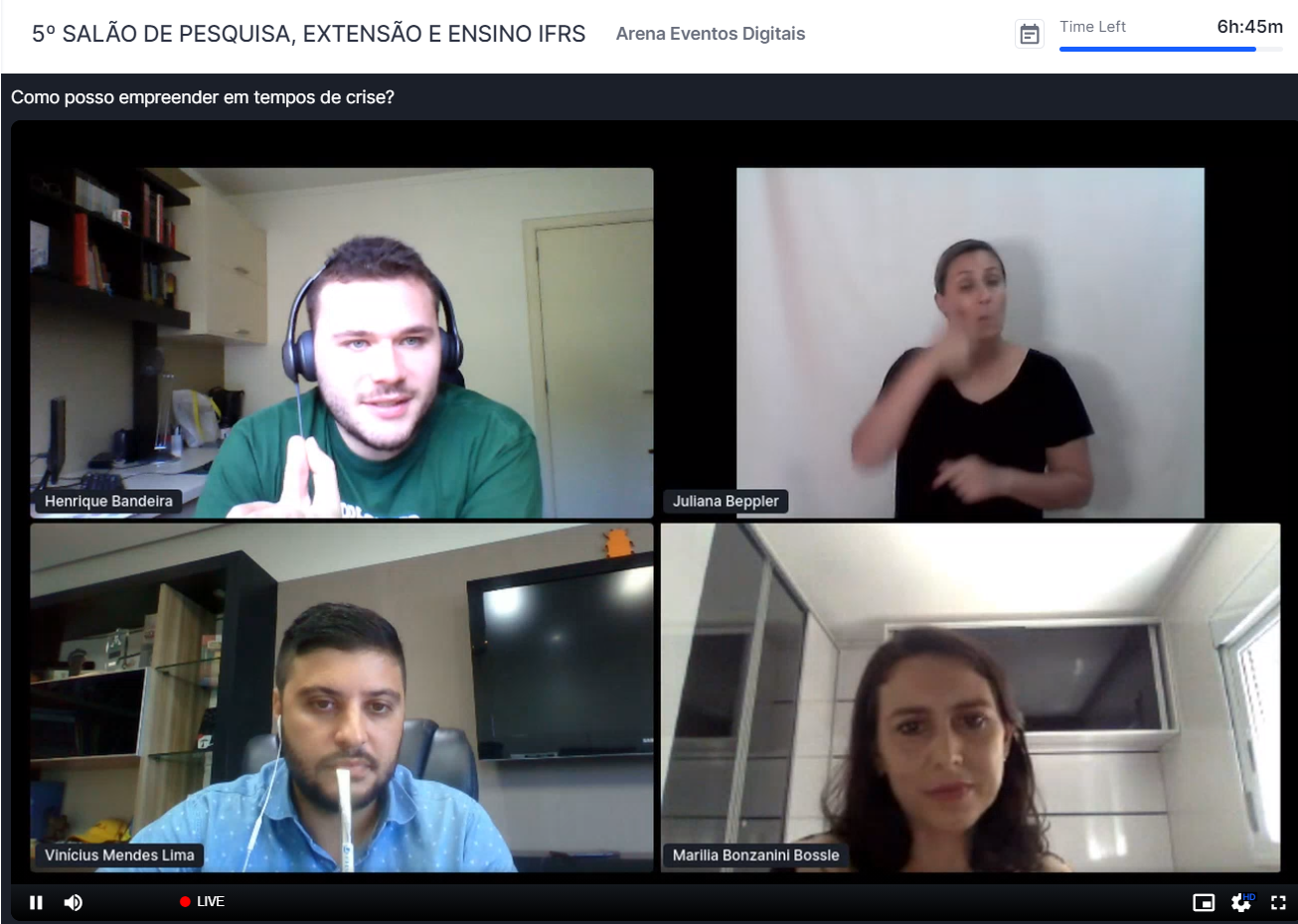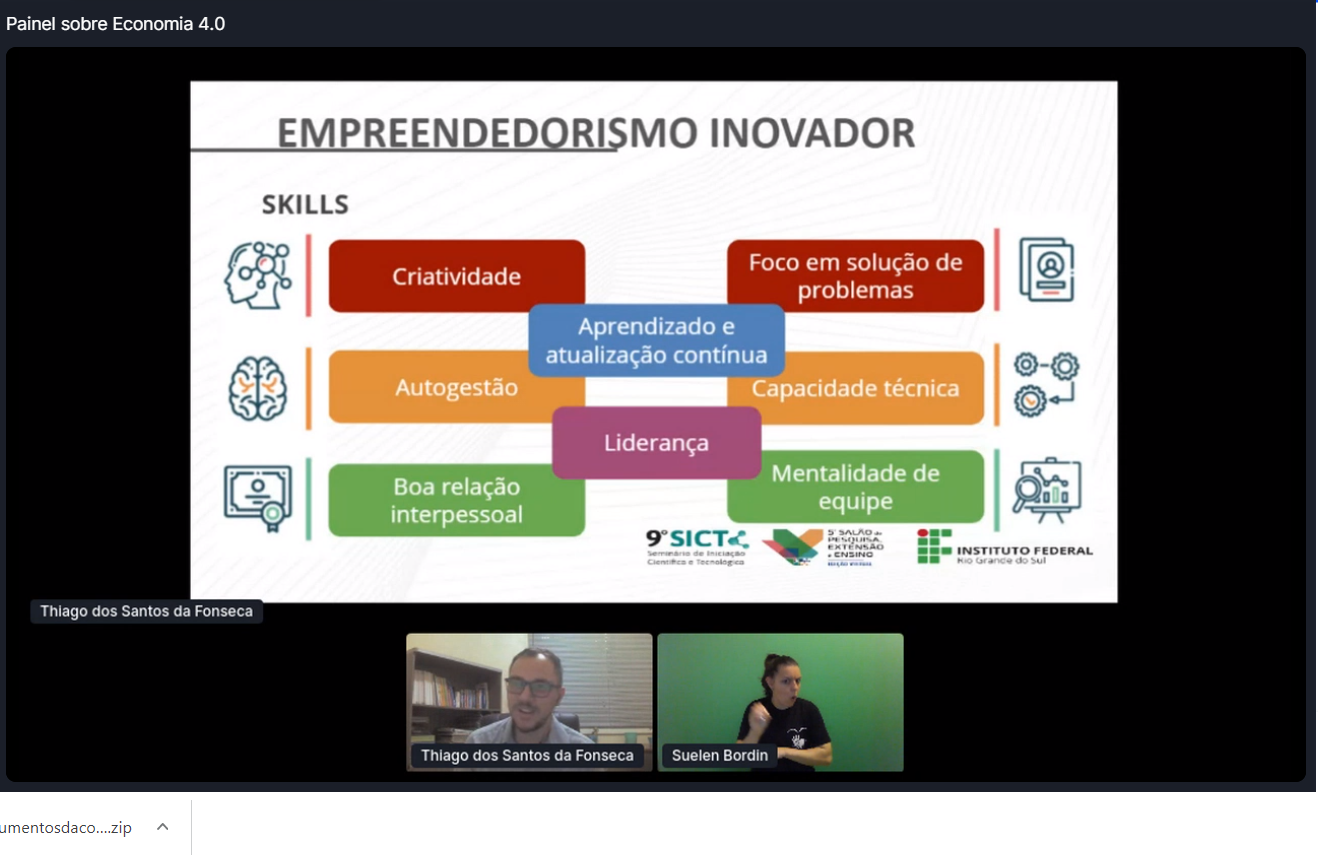 Um bate-papo contou com a participação de Ana Paula Matei, servidora da universidade Federal do Rio Grande do Sul (Ufrgs); Artur Gibbon, professor da Universidade Federal do Rio Grande (Furg); e Anderson Yanzer, chefe do Departamento de Pesquisa e Inovação e do Escritório de Projetos do IFRS. Eles lembraram que inovação não precisa ser algo “mirabolante”, mas está presente nas práticas do dia a dia. Foi abordado o potencial do Brasil em relação aos projetos de inovação, bem como os poucos investimentos nos projetos da área. A importância da aproximação entre as instituições de ensino e o setor produtivo e da atuação em rede foram destacados.
