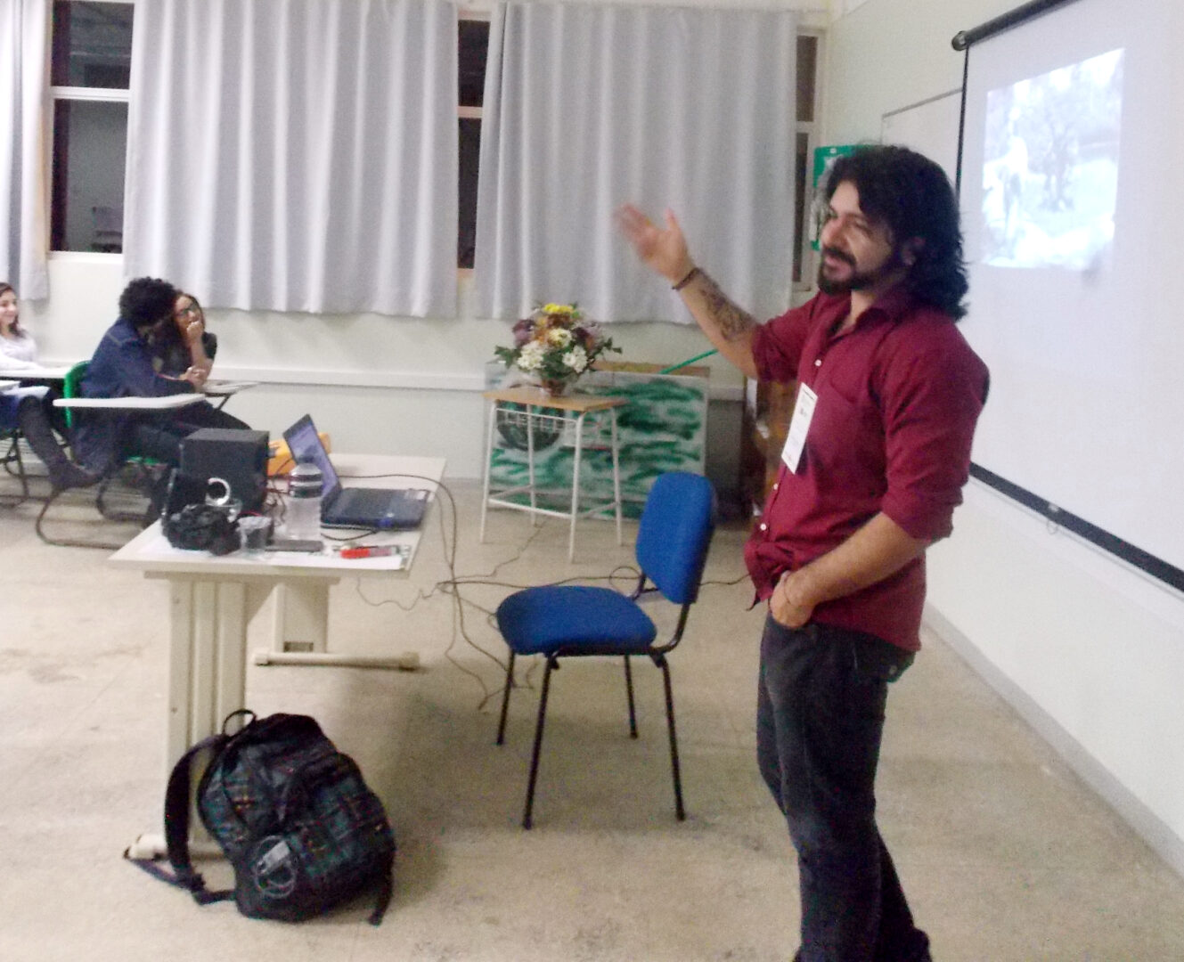 “Eu vim falar sobre o que está ao redor da fotografia. A gente pode olhar muito tutorial do youtube sobre o que é fotografar, mas eu queria trazer algo além da técnica, um pouquinho do pensamento crítico, da filosofia da arte que vem junto com a fotografia. Às vezes isso é pouco palatável para os alunos, especialmente no Ensino Médio, que não tem tanto interesse por assuntos um pouco mais densos. Então a gente tenta tratar isso a partir de questões como o que significa repertório para a fotografia, qual a importância de conhecer imagens, qual é a importância de ver várias imagens. A importância disso é que a gente se liberta para refazer imagens que a gente acha interessantes e também para fazer imagens que são diferentes das que existem no mundo. O que me deixa feliz de estar aqui é poder compartilhar um pouco das minhas visões sobre o fazer fotográfico e também despertar um pouco do olhar crítico que torna a fotografia algo interessante”.