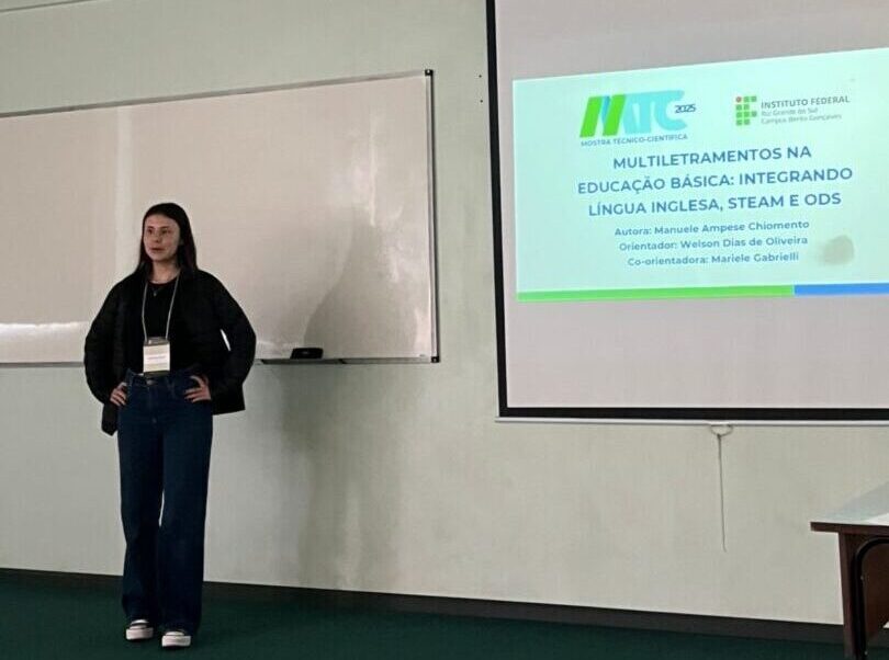 Manuele apresentou o projeto “Multiletramentos na Educação Básica: integrando Língua Inglesa, STEAM e ODS”, que propõe uma abordagem interdisciplinar ao ensino da língua inglesa, articulando-o com os Objetivos de Desenvolvimento Sustentável (ODS) da ONU e com práticas voltadas à inovação e à sustentabilidade.