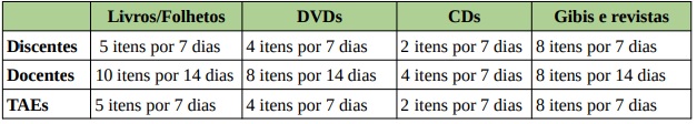 O empréstimo domiciliar é restrito aos servidores (docentes e técnico-administrativos) e alunos matriculados em cursos regulares, que possuam cadastro no sistema Pergamum. Alunos de cursos de curta duração podem realizar a consulta local do acervo da biblioteca. Discentes e técnico-administrativos podem emprestar até 5 (cinco) itens pelo prazo de 7 (sete) dias e docentes até 10 (dez) itens pelo prazo de 14 (quatorze) dias. Não é permitido o empréstimo domiciliar para obras de referência e com status de consulta local. O usuário pode realizar a consulta desses materiais na própria biblioteca.