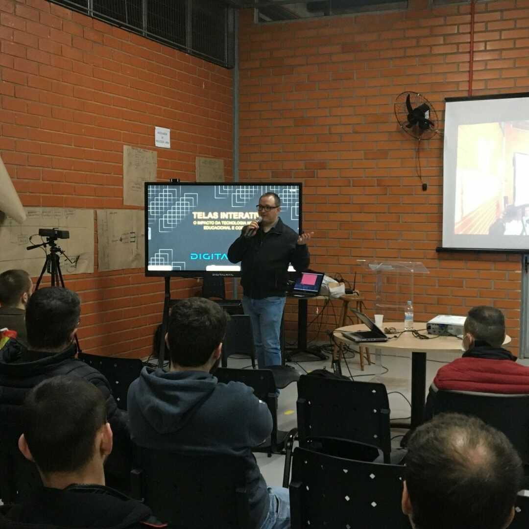 Após o coffee break, na segunda palestra, Deivis Grigol, da empresa Digital Way, abordou o tema “Telas Interativas na Educação”. Deivis comentou sobre os avanços da tecnologia, especialmente na área de educação, e apresentou alguns desafios para estudantes e professores se adaptarem a esses avanços.