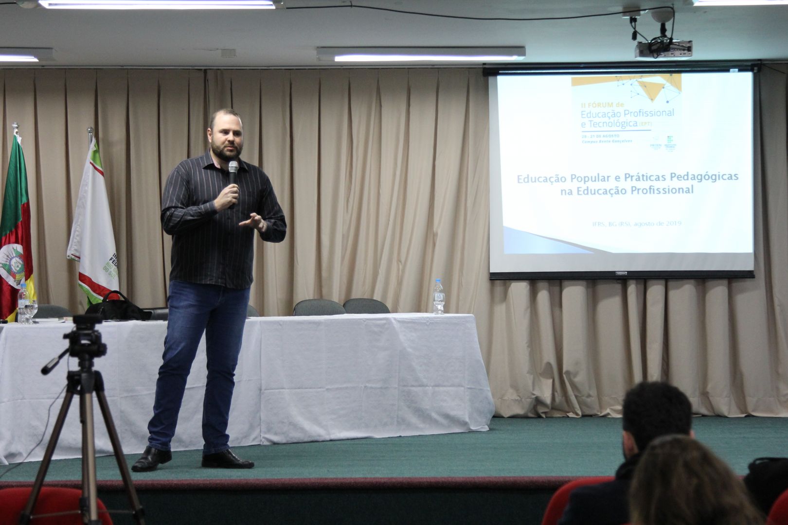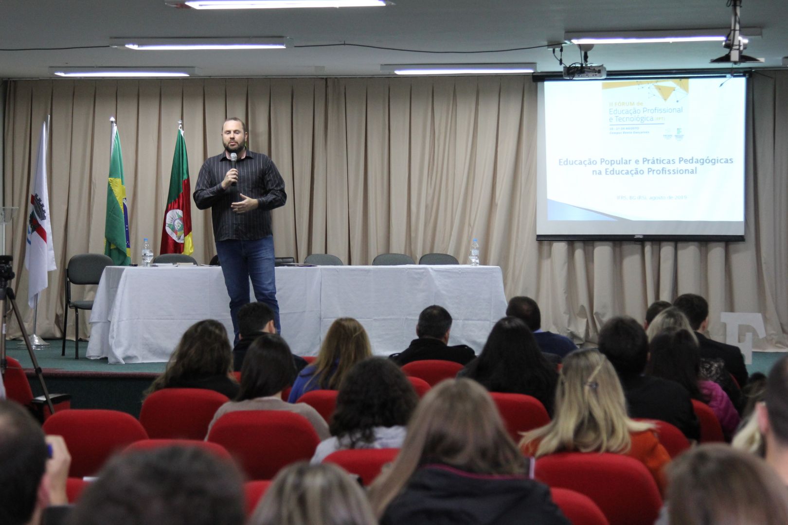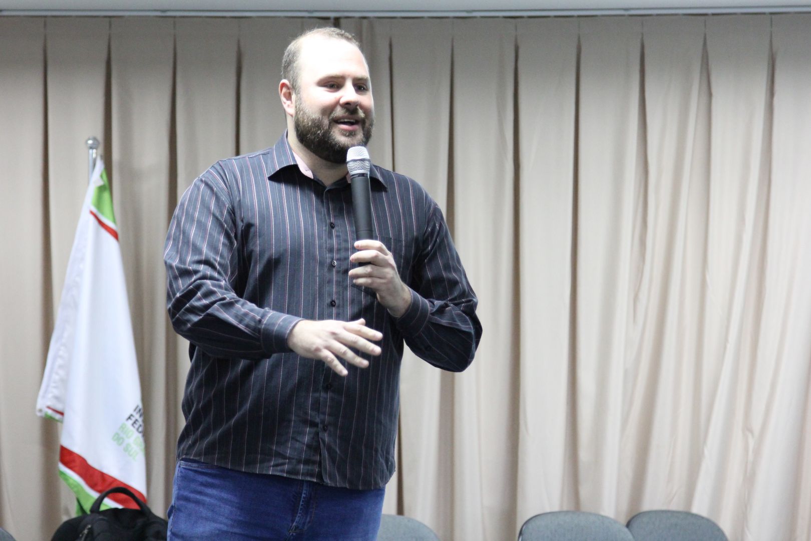 Após, os presentes acompanharam a palestra “Educação Popular e Práticas Pedagógicas na Educação Profissional” ministrada pelo professor da Universidade Federal da Fronteira Sul (UFFS), Thiago Ingrassia Pereira, que trouxe diversas discussões e paralelos entre momentos e pensamentos políticos do país e a educação nacional, assim como, a importância do ensino profissional e tecnológico para os públicos atendidos pela rede federal.
