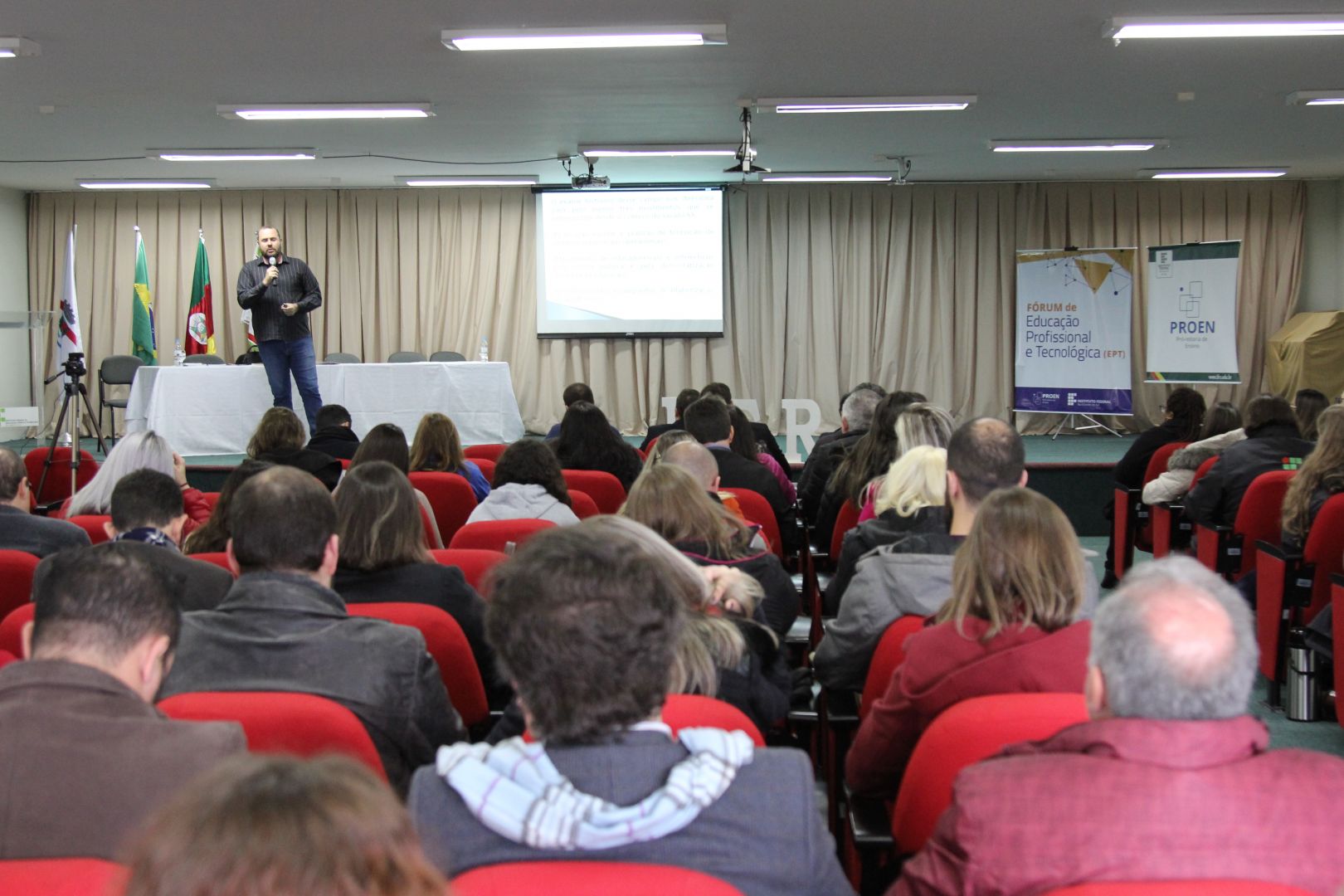 O pró-reitor de Ensino, Lucas Coradini, em sua fala de abertura, deu as boas vindas aos presentes e sinalizou a importância de refletir a Educação Profissional e Tecnológica neste momento crítico em que vive a educação pública nacional, com os cortes orçamentários.