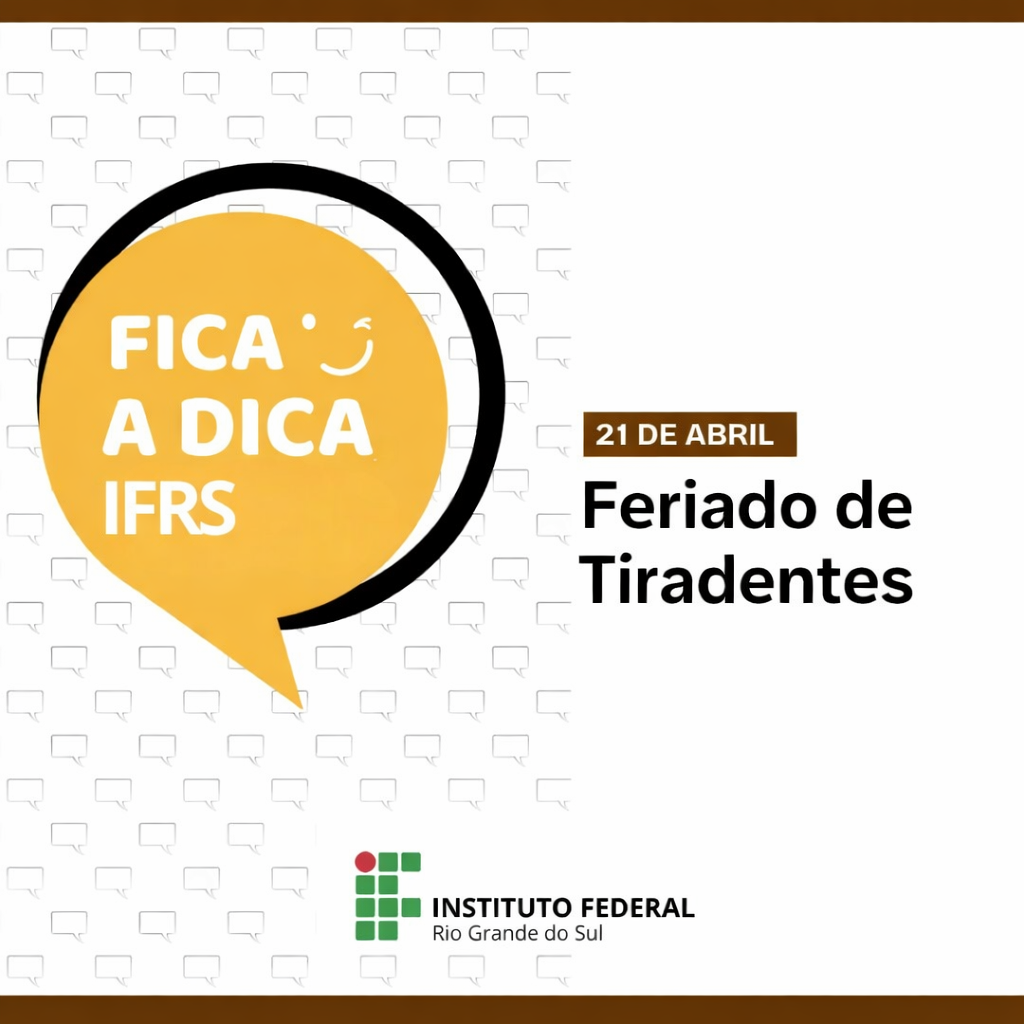 No quadro “Fica a Dica”, o Instituto Federal de Educação, Ciência e Tecnologia do Rio Grande do Sul (IFRS) passa a apresentar orientações rápidas e úteis sobre diferentes temas do cotidiano. A proposta é oferecer, de forma objetiva, uma dica por edição, contribuindo para informar e apoiar a comunidade. Hoje o tema é: Feriado de Tiradentes.