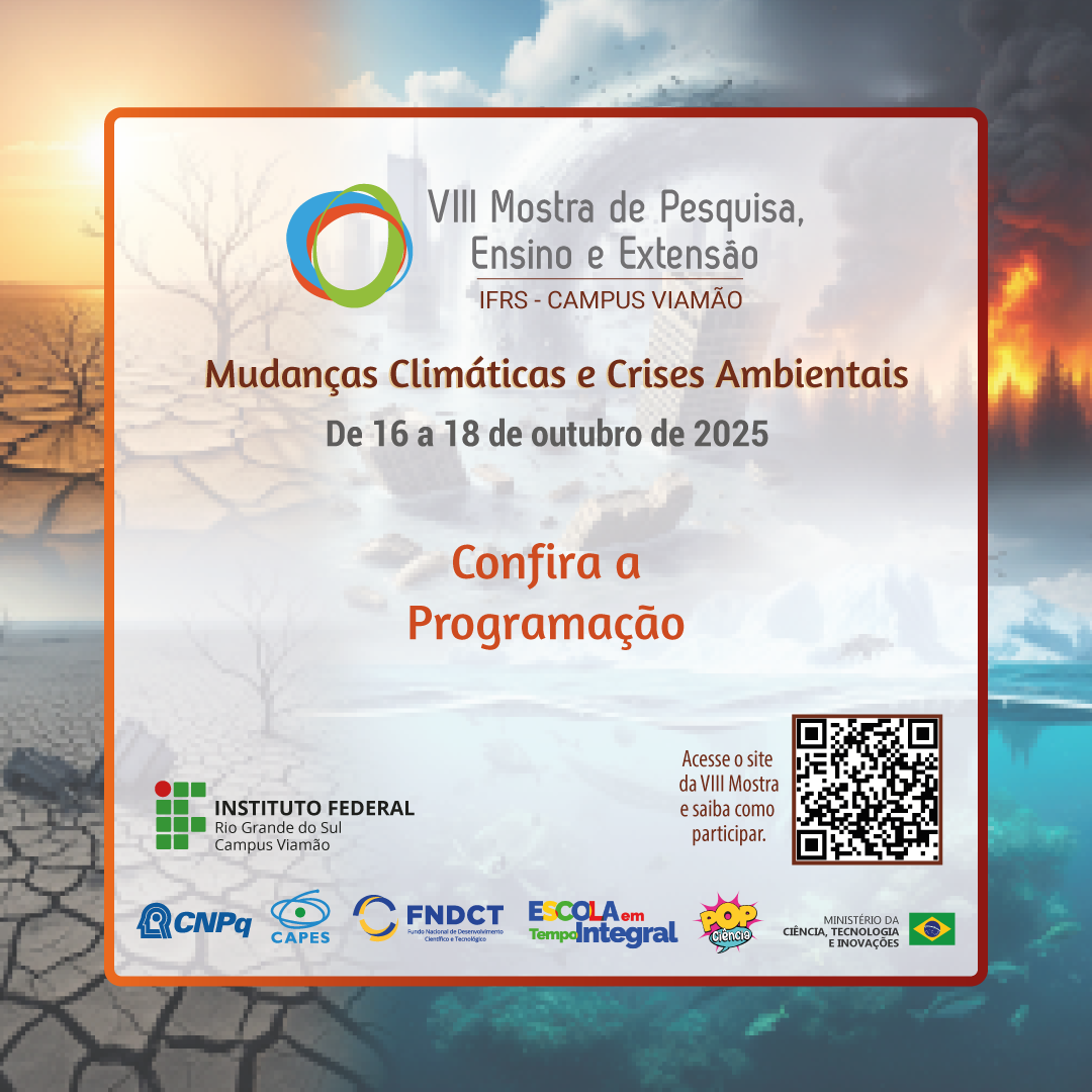 O Campus Viamão do Instituto Federal de Educação, Ciência e Tecnologia do Rio Grande do Sul (IFRS) realiza, de 16 a 18 de outubro de 2025, a VIII Mostra de Pesquisa, Ensino e Extensão, com o tema “Mudanças Climáticas e Crises Ambientais”. A programação já está disponível e pode ser conferida na página da mostra: ifrs.edu.br/viamao/mostra.