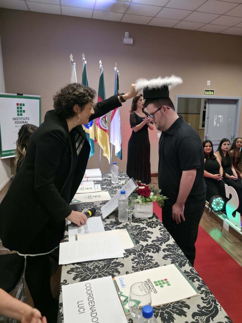Durante a cerimônia, a coordenadora de Registros Escolares do campus, Leda Maria Pereira da Silveira, realizou a leitura do termo de conclusão de curso, após a verificação dos resultados finais de aproveitamento acadêmico dos estudantes. Em seguida, o formando Gustavo Vaz de Azevedo proferiu o juramento institucional em nome da turma.