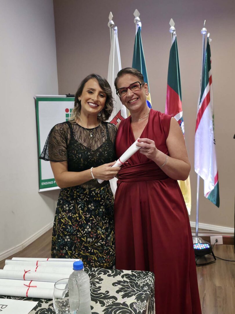 Representando a turma, as formandas Graziela Soares dos Santos Pacheco e Thaís de Leão Azambuja realizaram a fala dos concluintes. A cerimônia contou ainda com pronunciamentos da paraninfa da turma e da diretora-geral do campus.