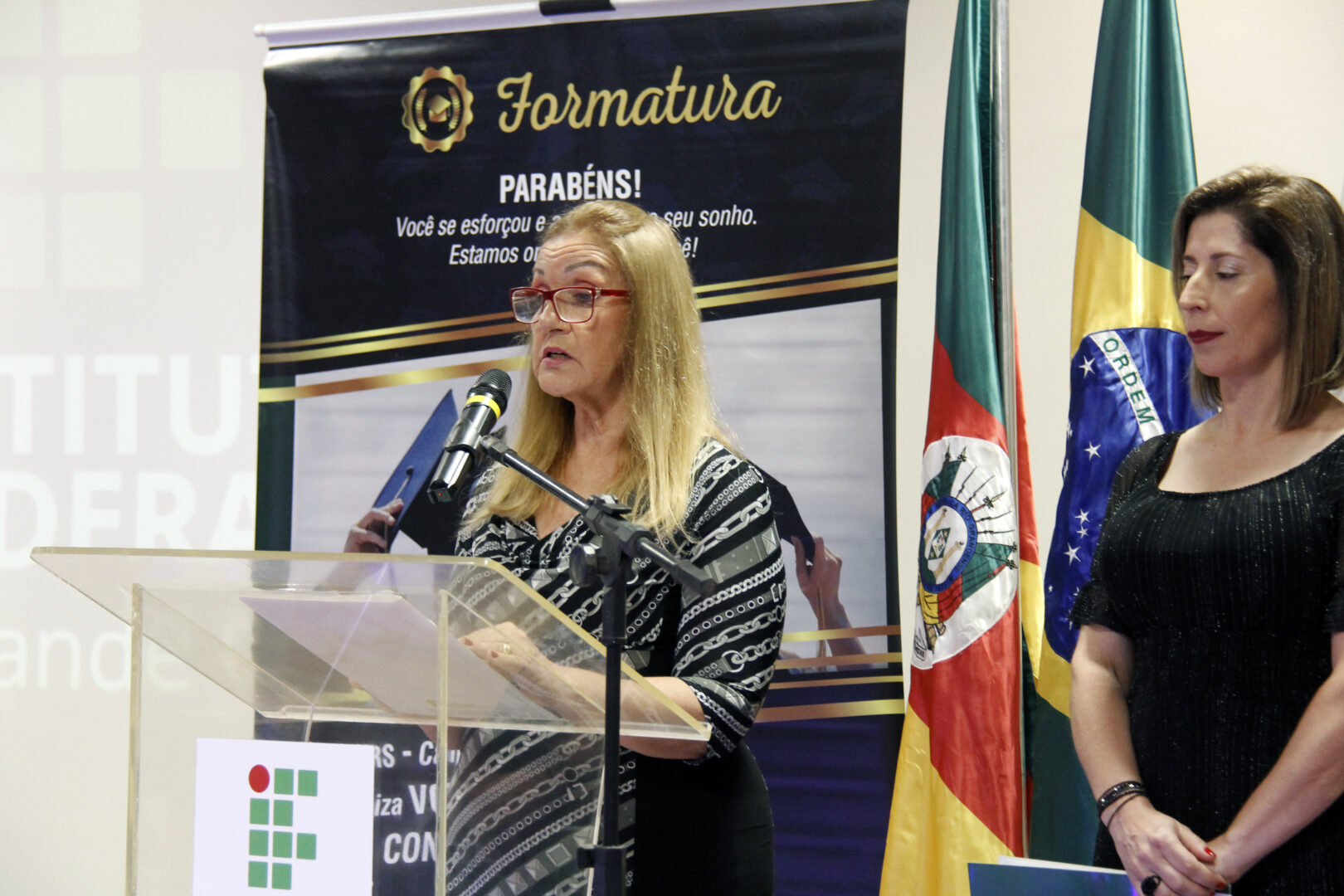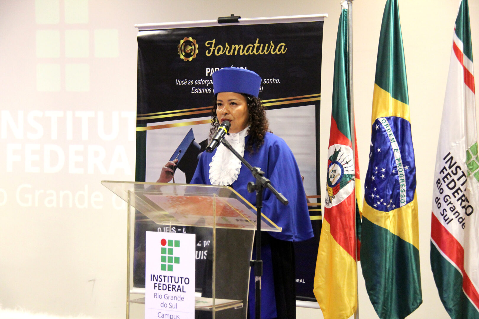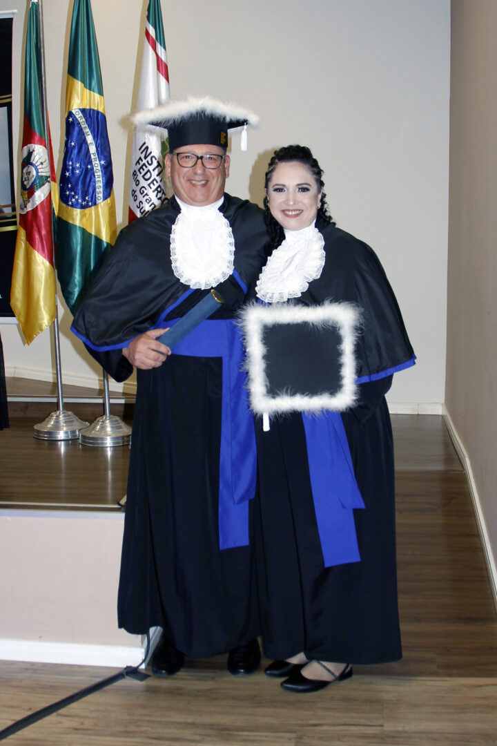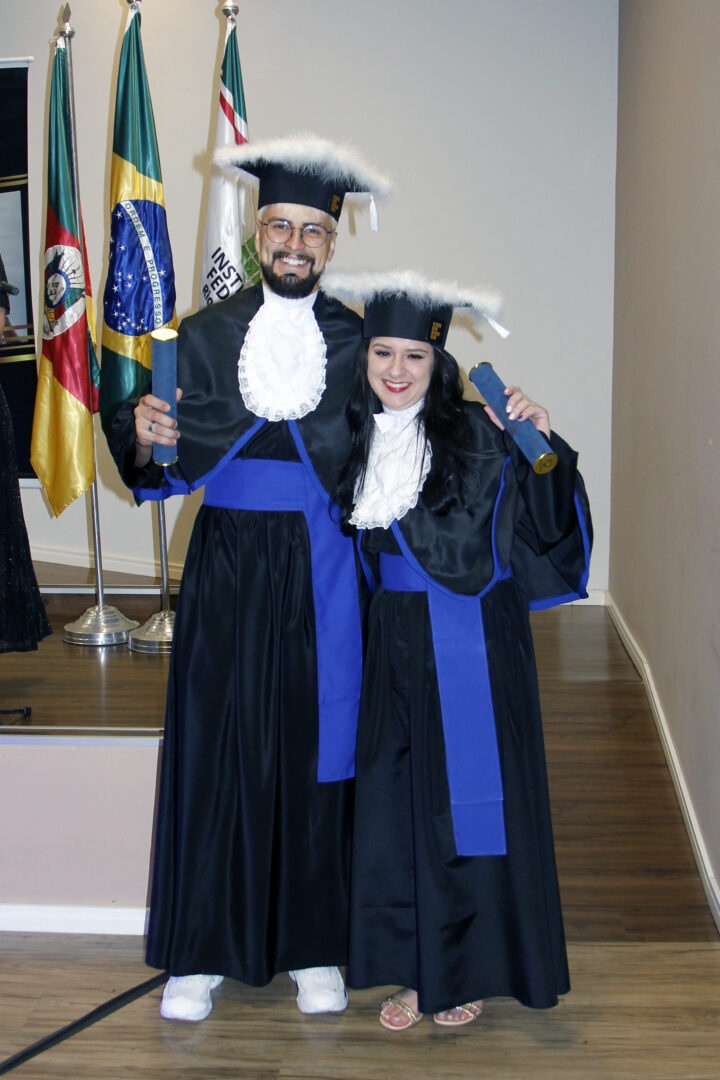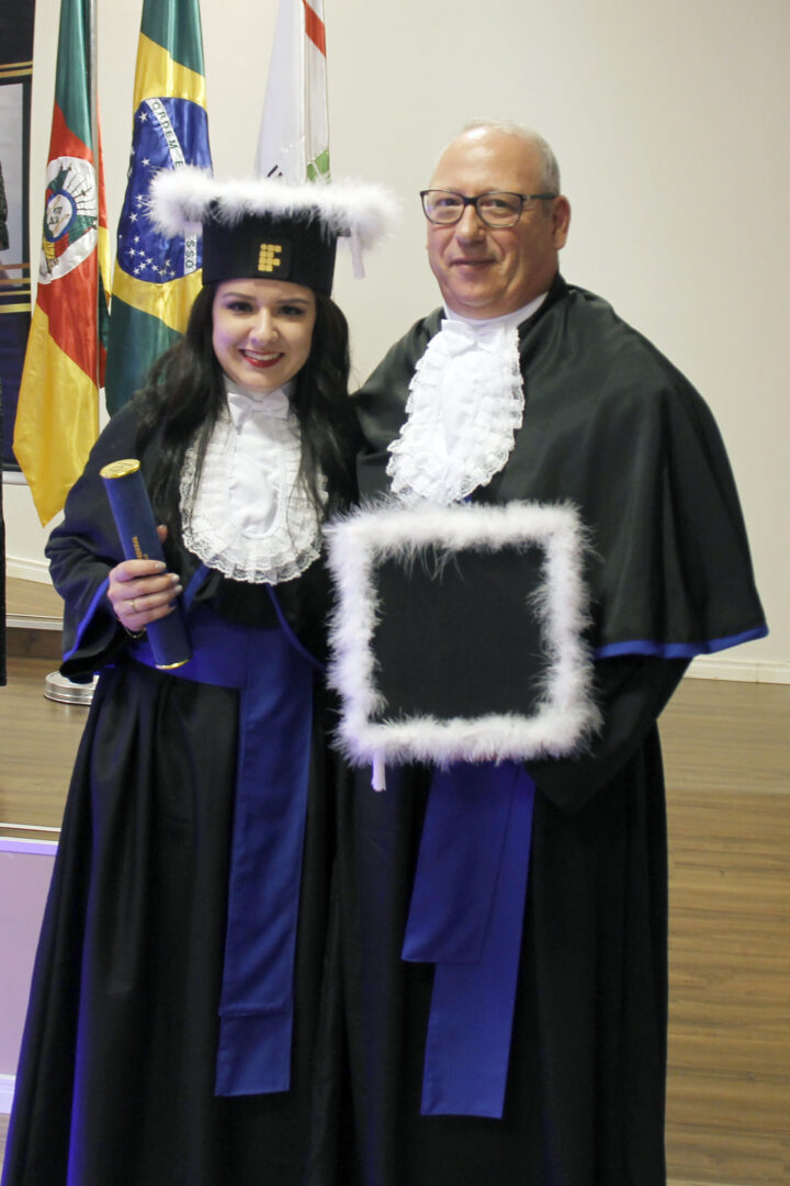 Entre os homenageados estavam os professores Adriano Andrejew Ferreira e Marise Keller dos Santos, além da coordenadora do curso e do paraninfo. A leitura da ata ficou a cargo da Coordenadora de Registros Acadêmicos, Leda Maria Pereira da Silveira. Representando a turma, a formanda Rosélia Castro proferiu o discurso como oradora, enquanto Jenifer Moretto Graboski realizou o juramento institucional. A cerimônia foi conduzida pela servidora Janaína Barbosa Ramos, que atuou como cerimonialista.