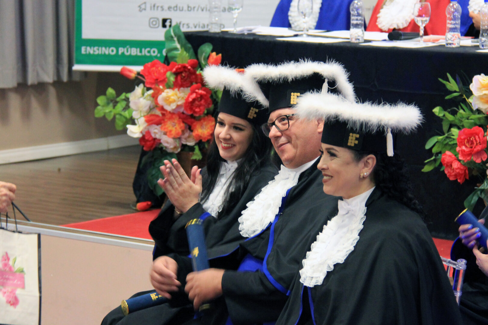 A mesa de honra foi composta pela Pró-Reitora Adjunta de Extensão, Elizete Cristina dos Santos, que representou o Reitor do IFRS, Júlio Xandro Heck; pela Diretora-Geral Substituta do Campus Viamão, Rafaela Soares Dionísio da Silva, representando a Diretora-Geral do campus, Maíra Baé Baladão Vieira; pela Coordenadora do curso de Gestão Ambiental, professora Rosana Serpa; e pelo paraninfo da turma, professor Robson Garcia da Silva.