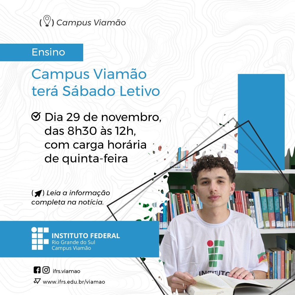 O Campus Viamão do Instituto Federal de Educação, Ciência e Tecnologia do Rio Grande do Sul (IFRS) terá sábado letivo no dia 29 de novembro, com atividades das 8h30 às 12h. As aulas corresponderão à carga horária de quinta-feira.