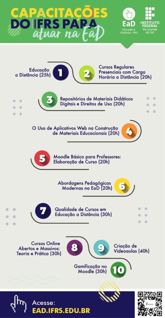 Alguns conhecimentos específicos podem auxiliar os servidores do IFRS a planejar e desenvolver as atividades pedagógicas não presenciais (APNPs). O funcionamento e as possibilidades do Moodle, abordagens pedagógicas modernas, videoaulas, o uso de aplicativos web… Temas como esses fazem parte de uma trilha de cursos on-line do Instituto Federal do Rio Grande do Sul (IFRS). Confira algumas opções abaixo e faça sua inscrição em: https://moodle.ifrs.edu.br. Confira cursos ofertados pelo IFRS e por outras instituições.