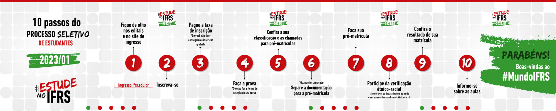 Quem tem interesse em estudar no Instituto Federal de Educação, Ciência e Tecnologia do Rio Grande do Sul (IFRS) no próximo ano precisa passar por uma seleção, que varia conforme o curso e o campus. Os documentos com informações e orientações (editais) do Processo Seletivo de estudantes 2023/1 do IFRS foram publicados nesta segunda-feira, 03 de outubro de 2022, no site ingresso.ifrs.edu.br. Os candidatos devem ler com atenção as informações referentes ao curso que pretendem fazer.