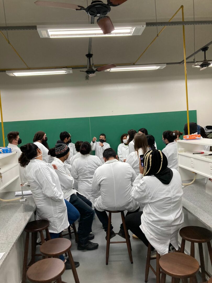 A aula, realizada pela professora Rosana Serpa, da disciplina de Microbiologia, foi uma introdução ao ambiente do laboratório, abordando conteúdos, como: noções de segurança e equipamentos de proteção individual e coletiva, conduta no laboratório, descarte de contaminantes biológicos e perfurocortantes, apresentação de vidrarias e de materiais de uso comum nesse ambiente e conhecimento e manuseio de equipamento de microscopia ótica.