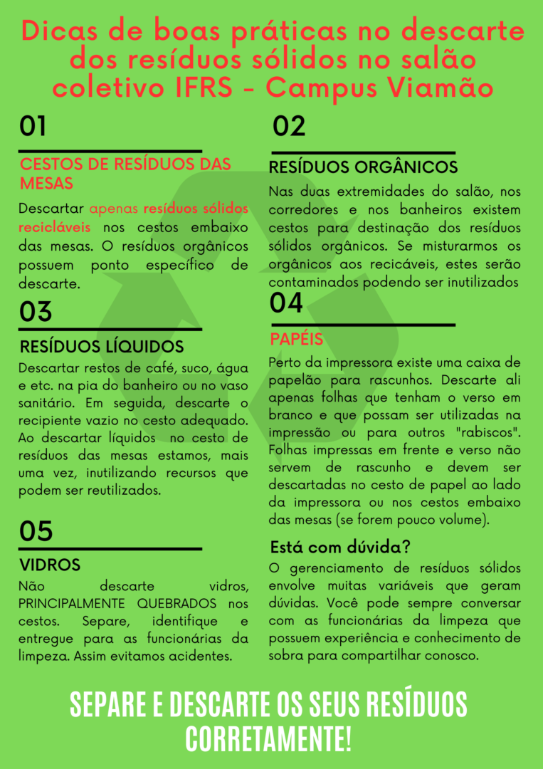 Os estudantes das disciplinas de Perícia, Auditoria e Certificação Ambiental do curso de Tecnologia de Gestão Ambiental, e Gerenciamento de Resíduos Sólidos e Projeto Integrador II do Técnico Subsequente em Meio Ambiente, realizaram no mês de maio e junho diagnóstico da situação do descarte de resíduos sólidos no salão coletivo do IFRS – Campus Viamão.