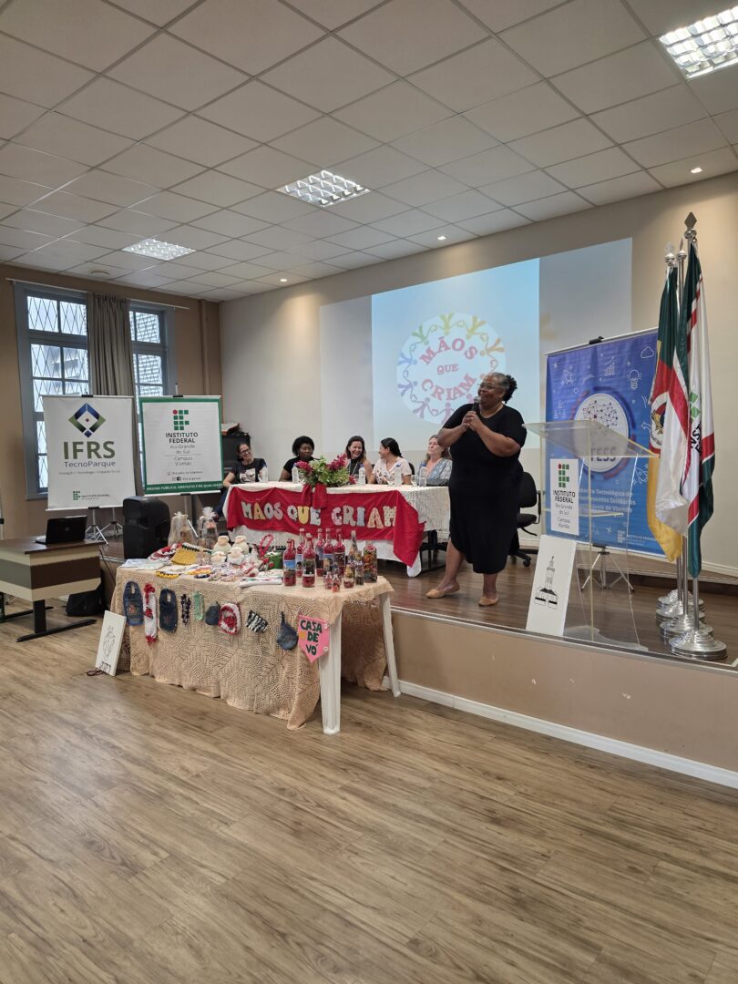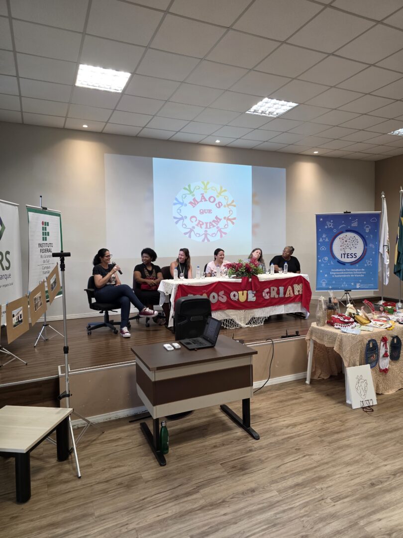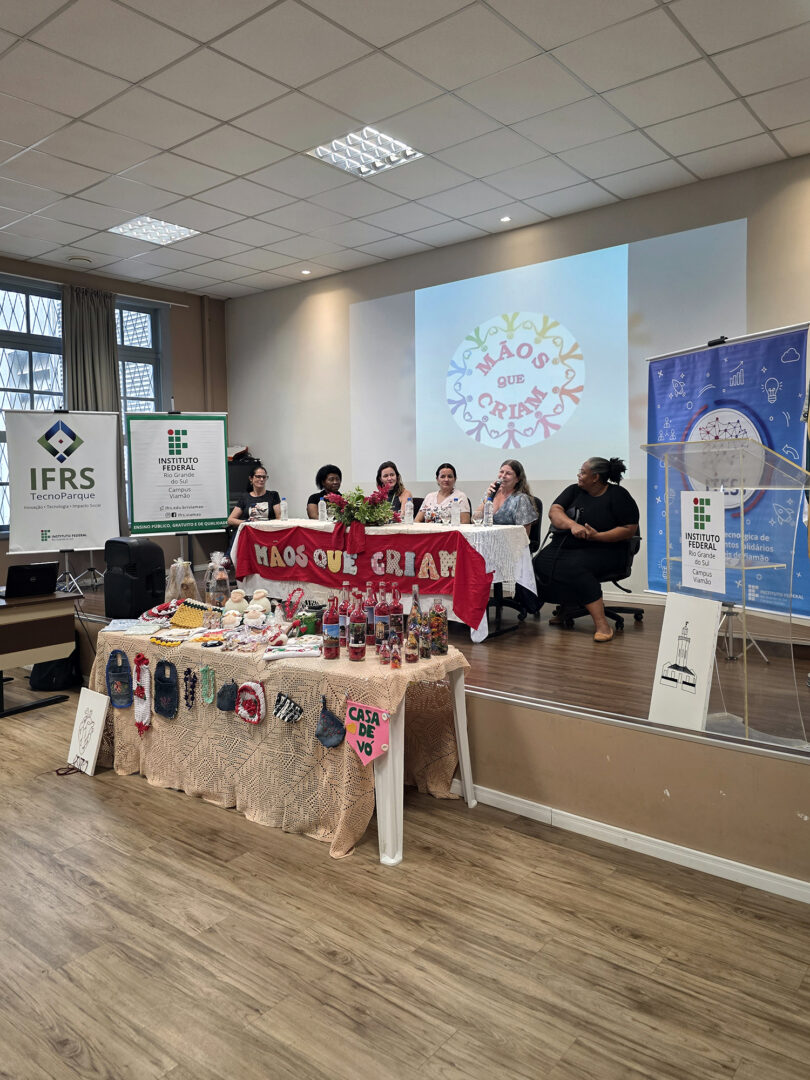 Compuseram a mesa Luiza Venzke Bortoli Foschiera, coordenadora de Extensão do IFRS – Campus Viamão; Jussara Conceição, do Instituto Raios de Sol; Karla Renée, do coletivo Diálogos de Resistência; Mônica Azevedo, da Associação Contraponto; Gislaine Borba, representante da Secretaria Municipal de Cultura; e Alê Fraga, que também conduziu o evento. As manifestações ressaltaram a relevância do trabalho em rede, da economia popular e solidária e das iniciativas voltadas ao fortalecimento da autonomia das mulheres no território.