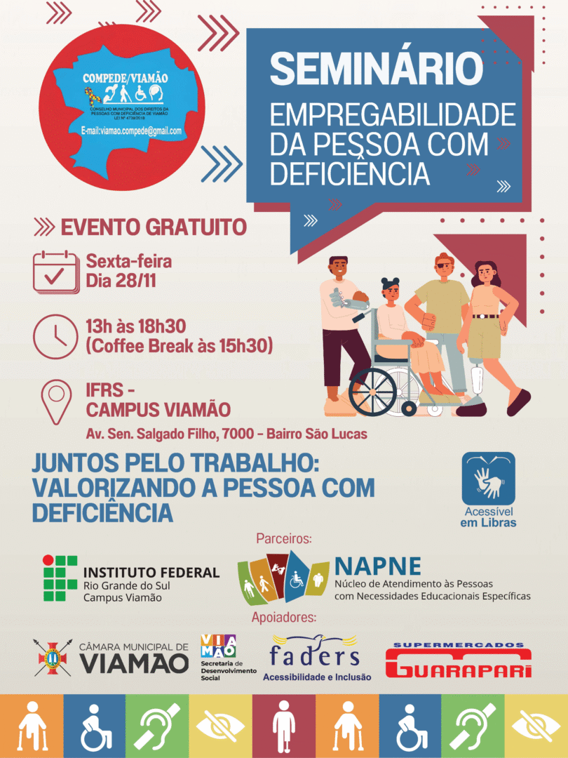 O Campus Viamão do Instituto Federal de Educação, Ciência e Tecnologia do Rio Grande do Sul (IFRS) sedia, no dia 28 de novembro, o seminário Empregabilidade da Pessoa com Deficiência. O evento é gratuito, ocorre das 13h às 18h30 e promove debates sobre inclusão profissional, acesso ao trabalho e políticas públicas voltadas às pessoas com deficiência.