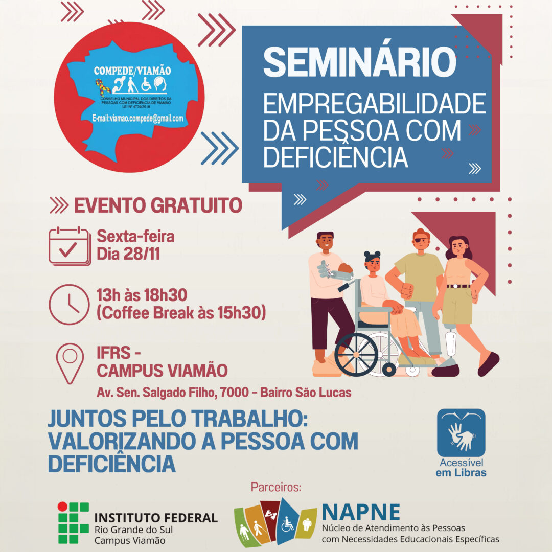 O Campus Viamão do Instituto Federal de Educação, Ciência e Tecnologia do Rio Grande do Sul (IFRS) sedia, no dia 28 de novembro, o seminário Empregabilidade da Pessoa com Deficiência. O evento é gratuito, ocorre das 13h às 18h30 e promove debates sobre inclusão profissional, acesso ao trabalho e políticas públicas voltadas às pessoas com deficiência.