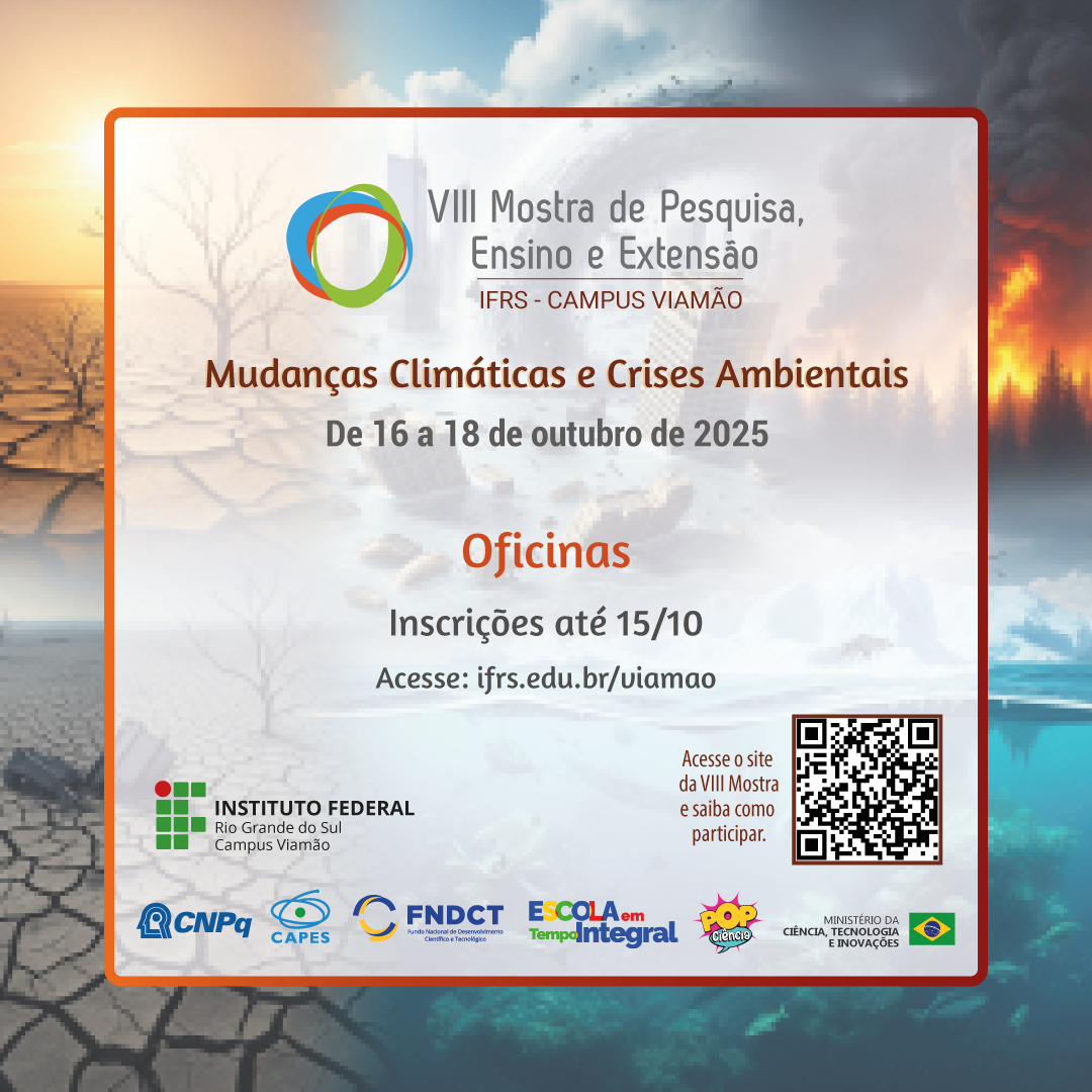 Estão abertas, até 15 de outubro de 2025, as inscrições para participar das oficinas da VIII Mostra de Pesquisa, Ensino e Extensão do Campus Viamão do Instituto Federal de Educação, Ciência e Tecnologia do Rio Grande do Sul (IFRS). As atividades serão realizadas no dia 16 de outubro, no campus, e são abertas à comunidade.