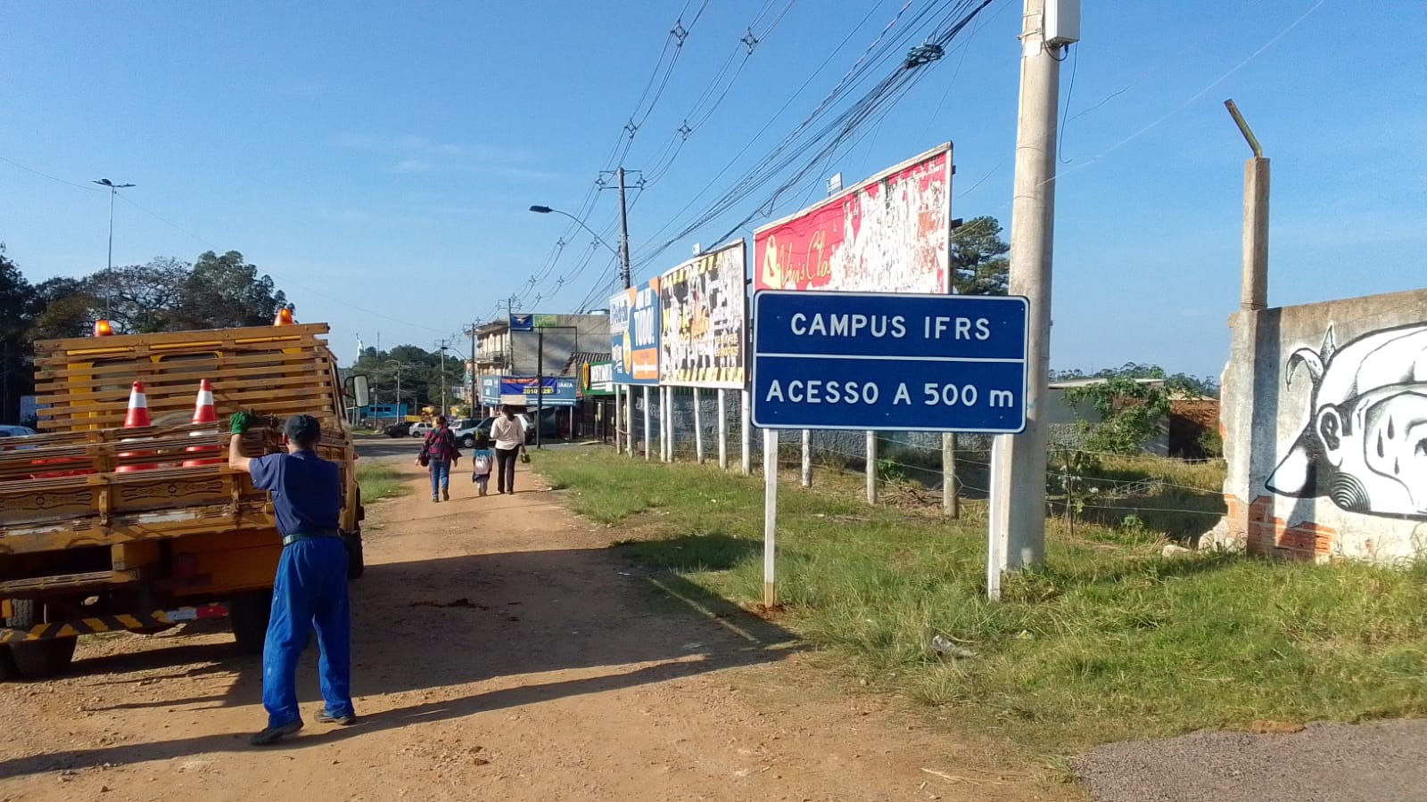 Após vários anos de espera, no dia 03 de julho, o IFRS – Campus Viamão finalmente foi agraciado com a instalação das tão aguardadas placas de sinalização rodoviária de nosso campus! Segundo o coordenador de Extensão do Campus, prof. Claudio Fioreze, a direção geral já havia enviado várias correspondências aos órgãos públicos solicitando este procedimento, mas foi somente em 2022, quando a aluna Patrícia Ferraz, do Curso Superior de Tecnologia em Gestão Ambiental, solicitou apoio do EcoViamão e da professora Marise para um projeto de gestão dos resíduos acumulados nas oficinas do DAER, que surgiu a oportunidade de, em conversas informais, retomar o tema. Patrícia, que é servidora do DAER, já havia avisado o Setor de Extensão na semana passada sobre a confecção das placas e, nesta segunda-feira, dia 03/07, para alegria do campus, as mesmas foram instaladas, sendo duas em cada sentido da RS 040, distantes 500m e 50m do Campus Viamão.