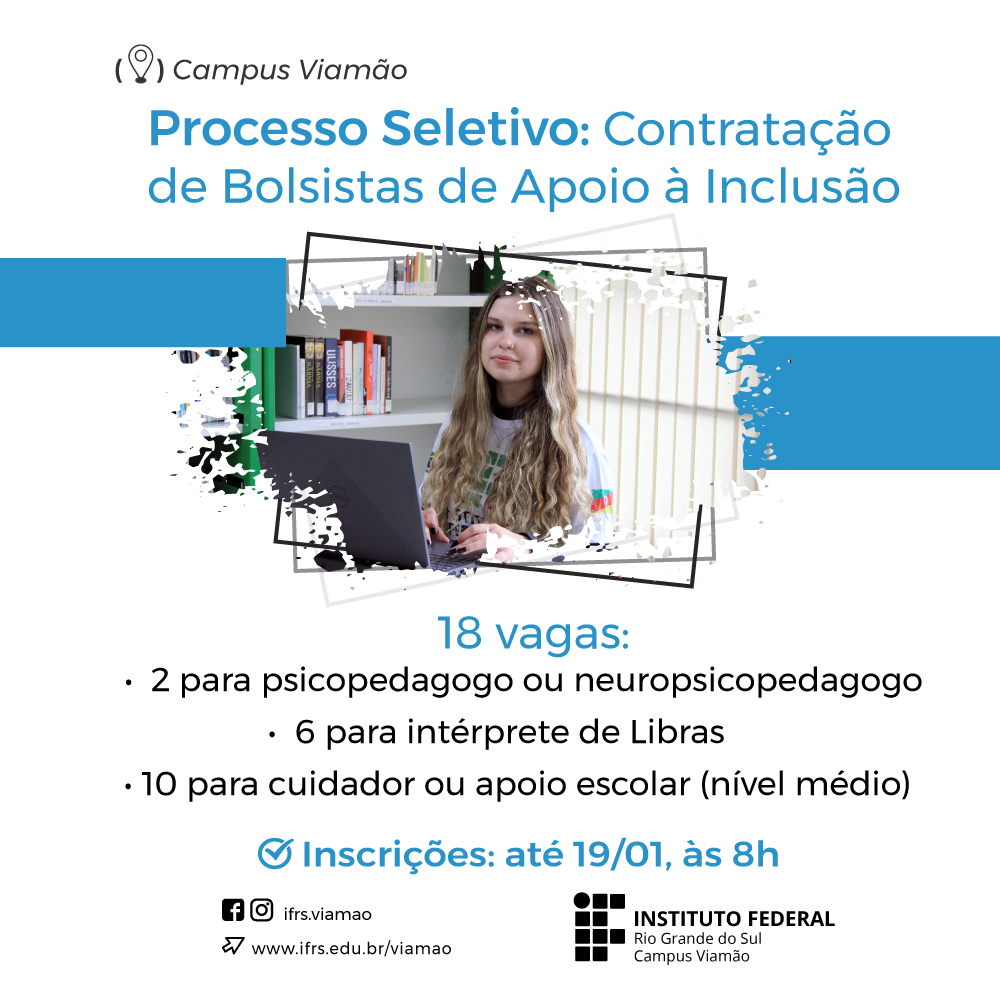 Estão abertas, até as 8h do dia 19 de janeiro, as inscrições para o processo seletivo que vai contratar bolsistas de apoio à inclusão para atuar em 2026 no Campus Viamão do Instituto Federal de Educação, Ciência e Tecnologia do Rio Grande do Sul (IFRS). O edital prevê 18 vagas para as atividades de psicopedagogo, intérprete de Libras e cuidador/apoio escolar (nível médio).