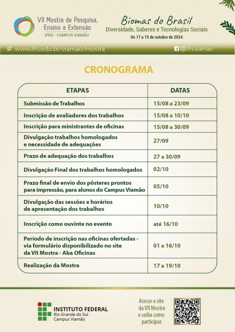 Cronograma Confira o Cronograma da VII Mostra de Pesquisa, Ensino e Extensão do Campus Viamão. Compartilhar conteúdo: Facebook Twitter LinkedIn Pinterest WhatsApp Última atualização em 25/09/2024
