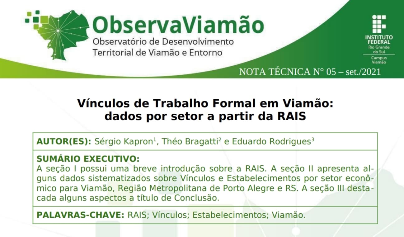 Os temas das Notas Técnicas deram continuidade no acompanhamento da execução do orçamento da Prefeitura de Viamão e dos dados sobre trabalho e empresas de Viamão, através da RAIS. A Nota Técnica Nº5 mostrou que Viamão encerrou 2019 com 21.719 postos de trabalho e 2.210 estabelecimentos formais. Estes dados foram detalhados por setores econômicos e comparados com a Região Metropolitana de Porto Alegre (RMPA) e o RS. Um destaque é que os trabalhos formais de Viamão equivaliam a apenas 9% da sua população, enquanto na RMPA representavam 30%.