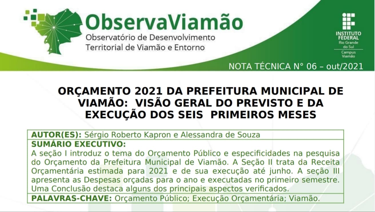 A Nota Técnica Nº6 apresentou o Orçamento Municipal de Viamão para o ano de 2021 e sua execução até a primeira metade do ano. A receita total prevista de R$ 600,2 milhões foi mostrada pelos principais grupos que a compõe, assim como os valores executados, que alcançaram R$ 240,9 milhões no primeiro semestre. Já as despesas, que pelos dados de acesso público foram estimadas em R$ 597,8 milhões, foram detalhadas por grupos de despesa e pelos órgãos da administração municipal. Sua execução total, até a metade do ano, somou R$ 205,5 milhões, ou 34,4% do total previsto para o ano.
