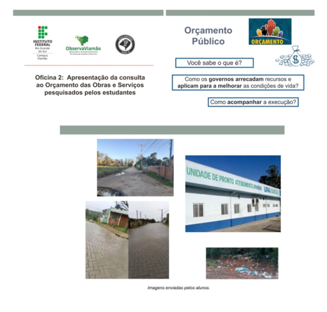 O tema das NTs sobre orçamento do município foi objeto do projeto Simplificando e Popularizando o acesso e a compreensão da economia em uma relação interdisciplinar e indissociável, entre ensino, pesquisa e extensão, realizado em parceria com a Escola Estadual Farroupilha, do bairro Querência, próximo ao IFRS – Campus Viamão. Dados preliminares foram apresentados aos estudantes do Ensino Médio, com o apoio de seus professores de Geografia Márcio Gil e Josiane Borges e de Sociologia, Maria Antonia Lima. Nesta primeira oficina, em formato remoto, os estudantes foram desafiados a identificar, no entorno de suas residências, algumas obras ou serviços públicos que estivessem em funcionamento, em execução ou que fossem necessários. Os estudantes exercitaram identificar, fotografar e relacionar a qual órgão municipal cabia a competência, formatando um trabalho para compor suas avaliações de ensino. Ao total foram apresentadas 26 obras ou serviços, sendo a metade relativa a pavimentação, com destaque ainda para paradas de ônibus e postos de saúde. Do total, 6 foram apresentadas como concluídas, 1 em execução e 19 como necessárias. A segunda oficina com os estudantes, também remota, apresentou os dados sistematizados.