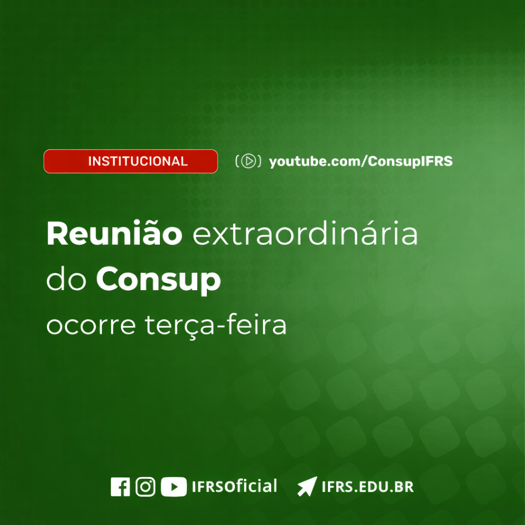 A primeira reunião extraordinária de 2026 do Conselho Superior (Consup) do Instituto Federal de Educação, Ciência e Tecnologia do Rio Grande do Sul será realizada no dia 31 de março. O encontro ocorre às 9 horas, por webconferência, com transmissão pelo canal do Consup no YouTube.