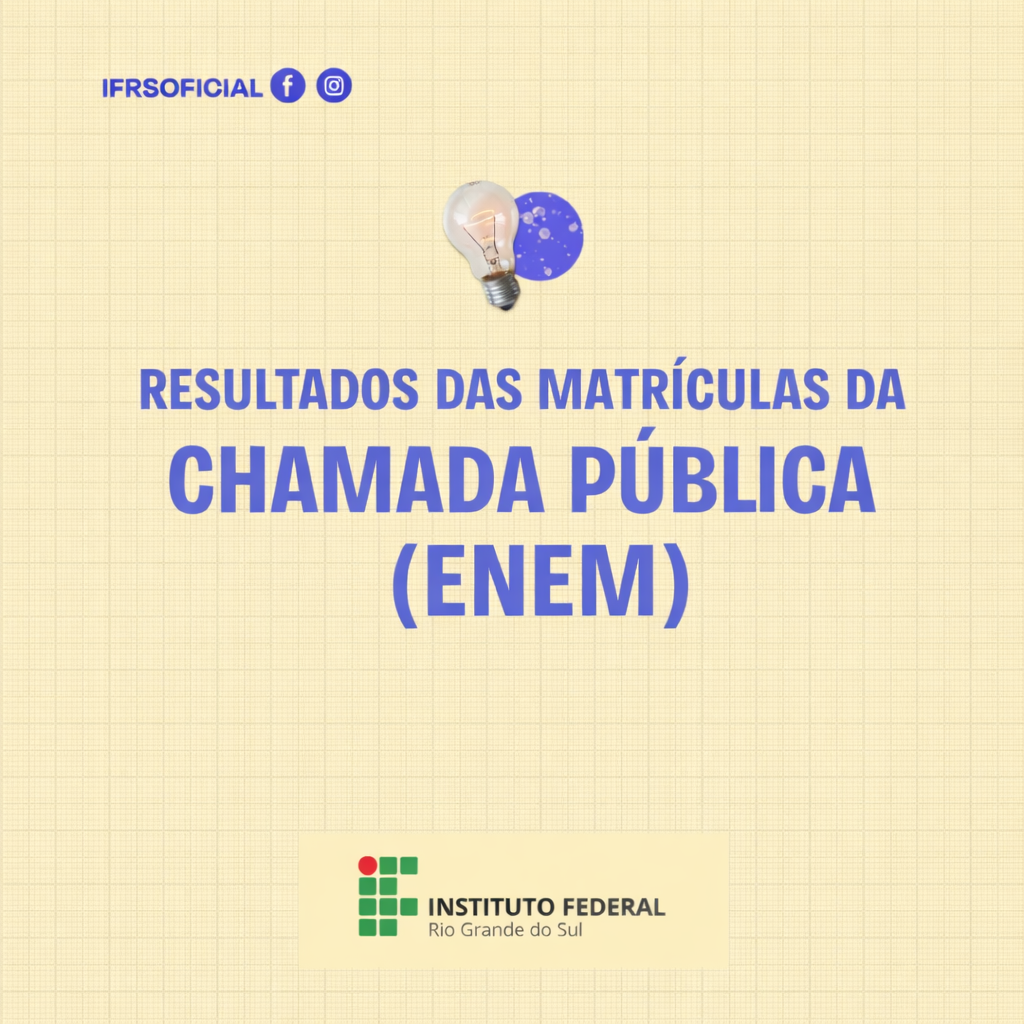Serão publicados, nesta segunda-feira, 02 de fevereiro de 2026 (até as 23h59), no site ingresso.ifrs.edu.br, os resultados das matrículas da Chamada Pública (Enem) do Processo Seletivo de Estudantes 2026/1 do Instituto Federal de Educação, Ciência e Tecnologia do Rio Grande do Sul (IFRS).