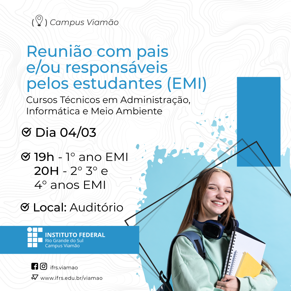 A Coordenação de Ensino Médio Integrado do Campus Viamão do Instituto Federal de Educação, Ciência e Tecnologia do Rio Grande do Sul (IFRS) promoverá, no dia 4 de março, a primeira reunião do ano letivo com pais e responsáveis por estudantes dos cursos Técnicos Integrados ao Ensino Médio em Administração, Meio Ambiente e Informática.
