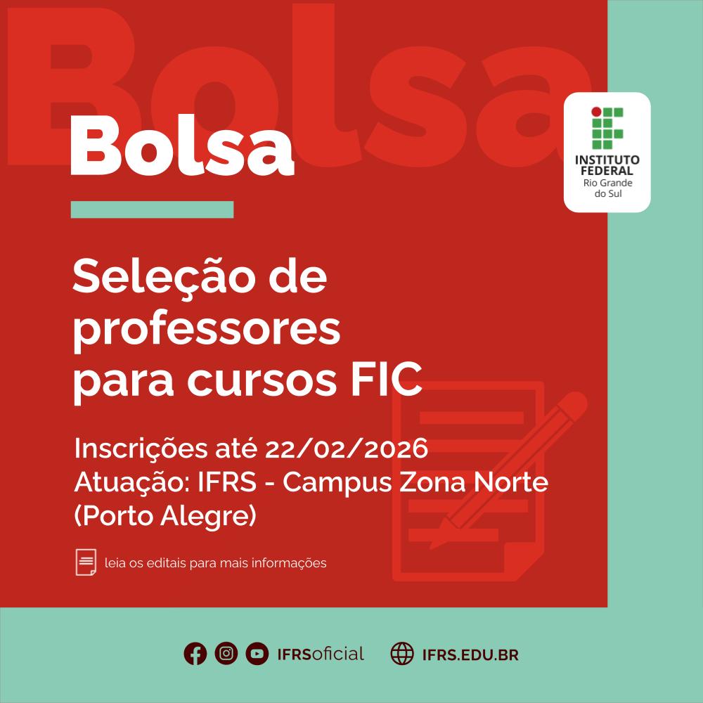 O IFRS – Campus Zona Norte (Porto Alegre) está com nove vagas para profissionais interessados em atuar como bolsistas no cargo de professor de cursos de Formação Inicial e Continuada (FIC).